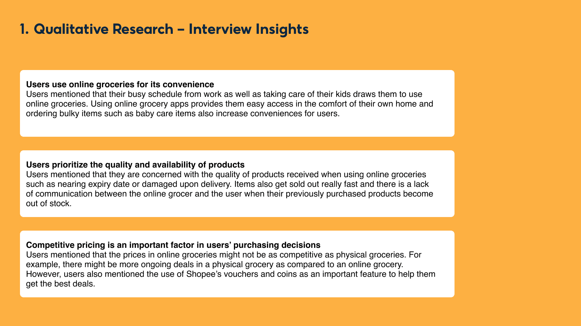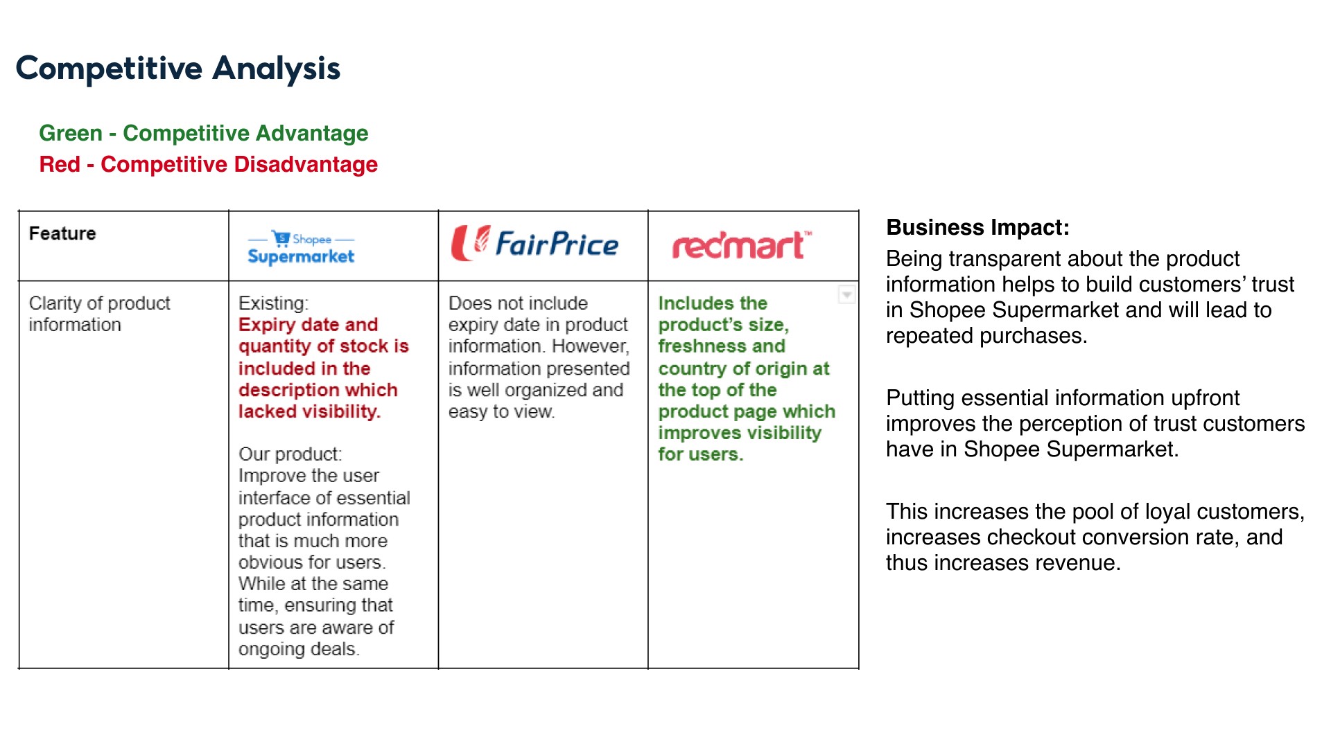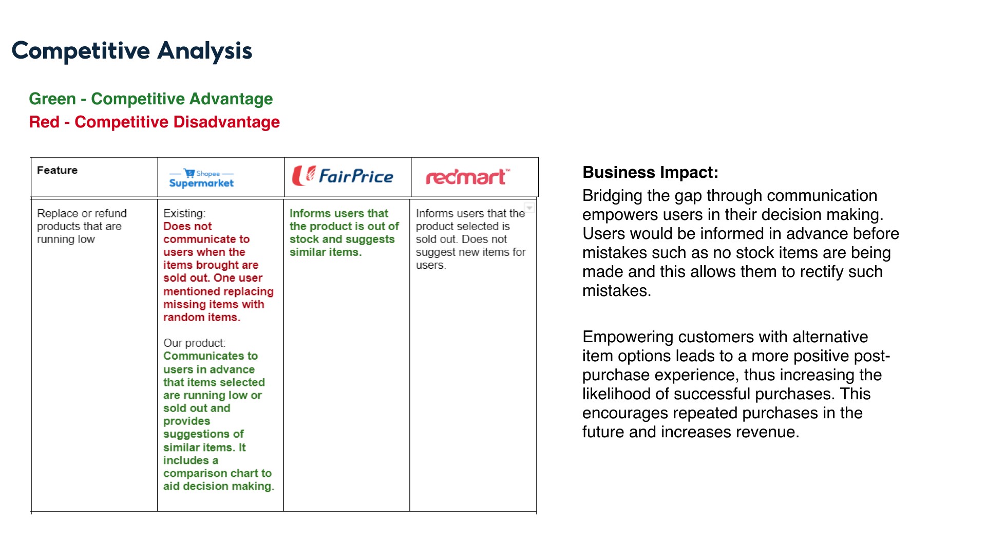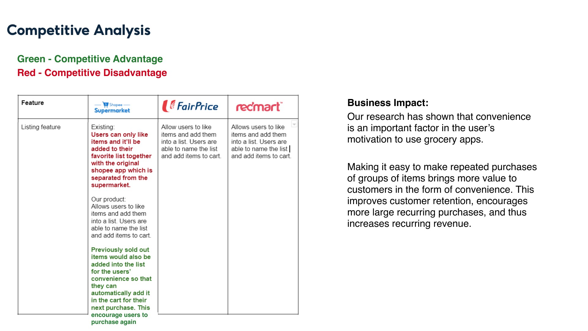 Lastly, to validate our ideas, we decided to conduct a comparative UX analysis on Shopee Supermarket’s competitors and how they tackle these features. In doing so, we would also be analysing how redesigning these 3 features would have a business impact on Shopee Supermarket.