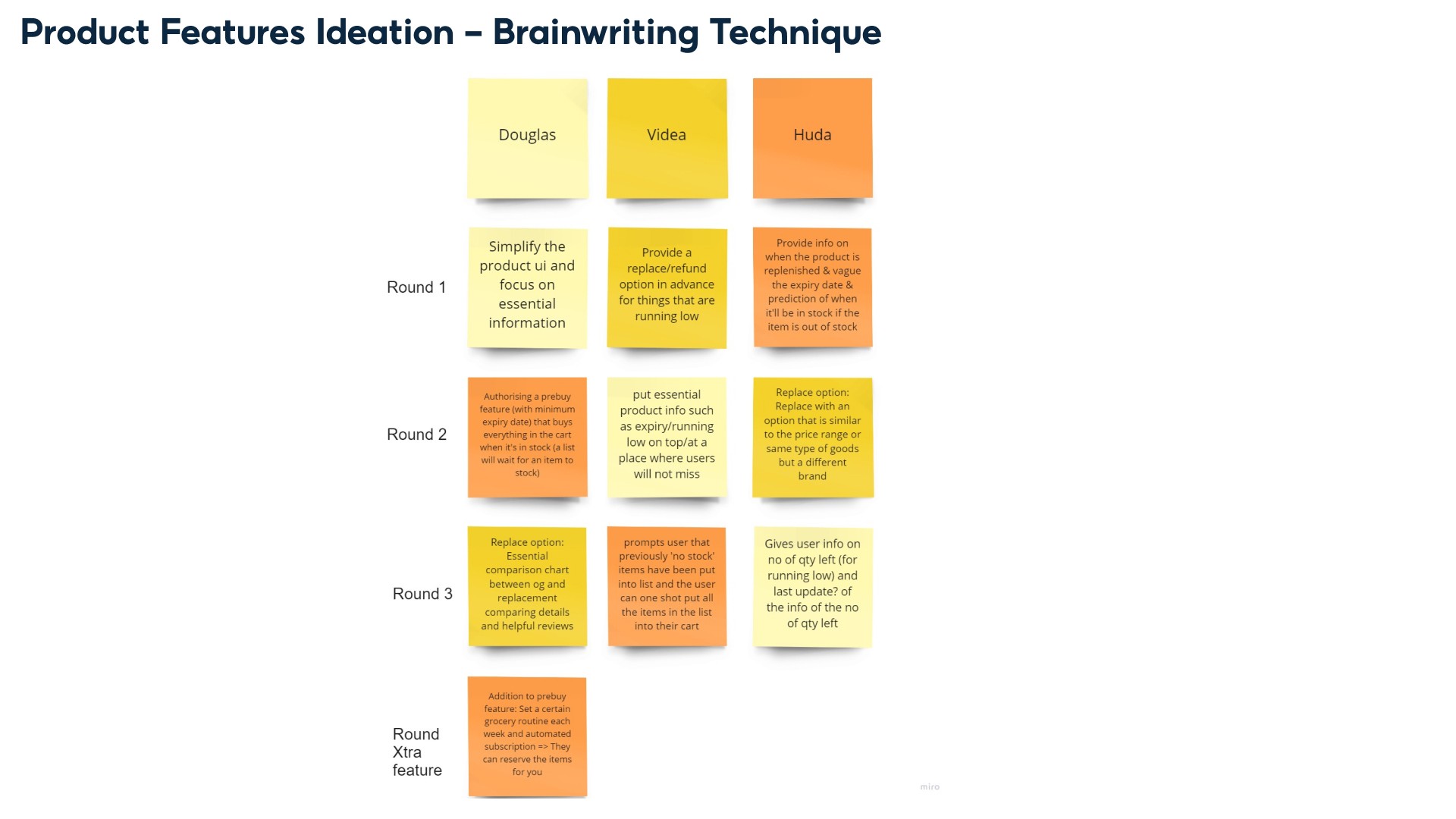 After specifying our main product specifications, we brainstormed ideas on specific features we want to improve on Shopee Supermarket using the brainwriting technique.
