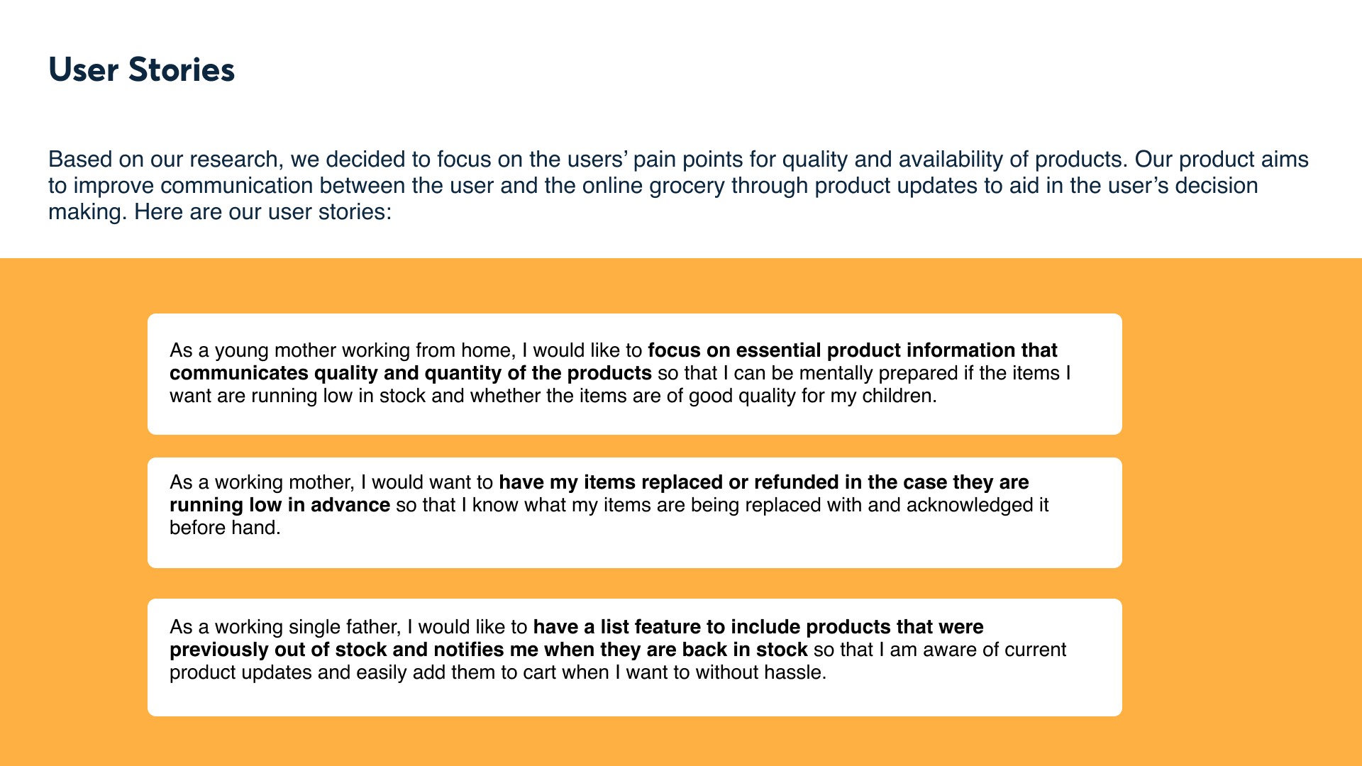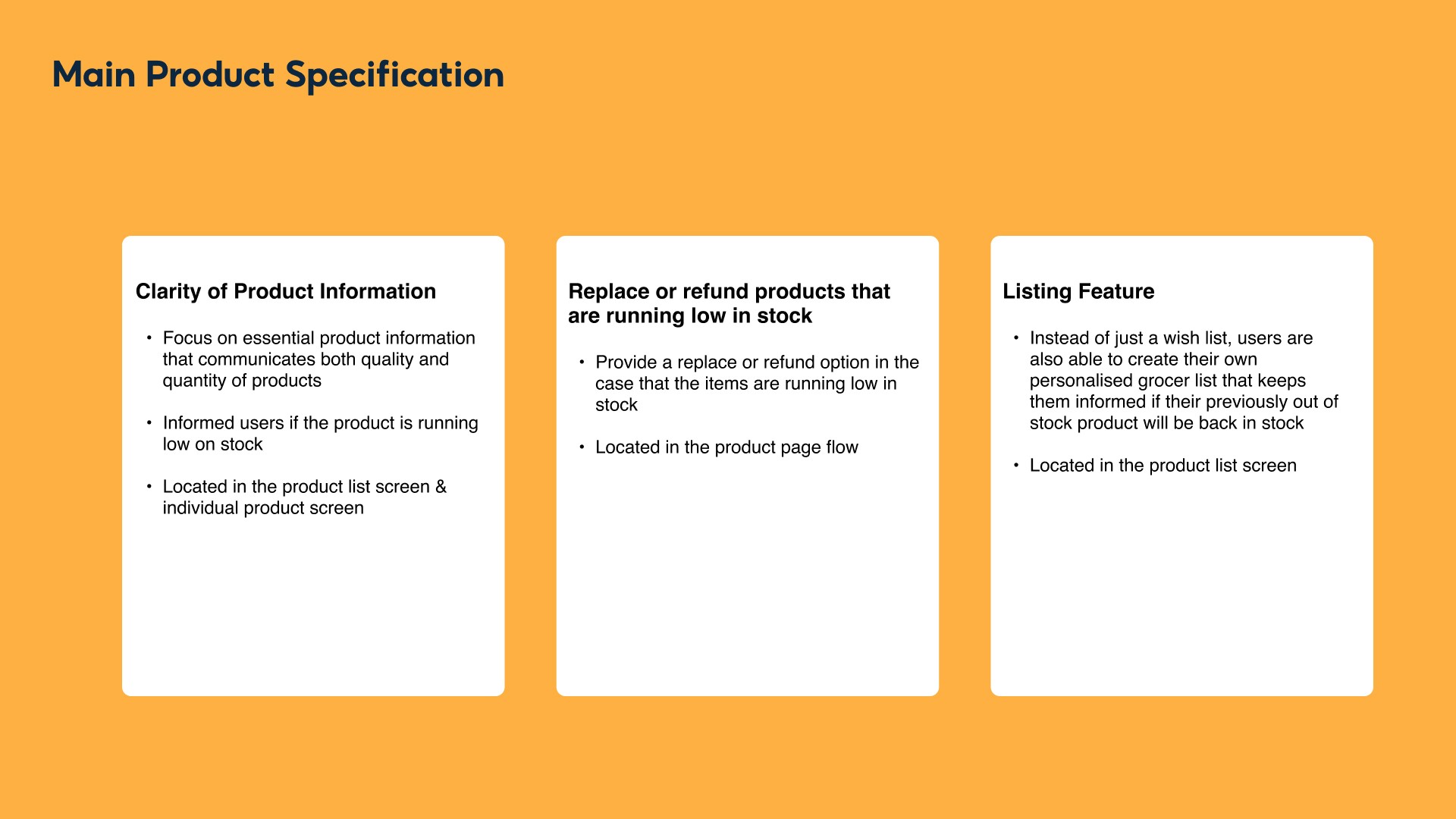 Based on our user research, user stories, reframed problem statement and also factoring our limited time, we have decided to focus on redesigning 3 main features to to improve communication between the user and the online grocery through product updates to aid in the user’s decision making and meet our targeted users’ needs. Here are our main product specifications: