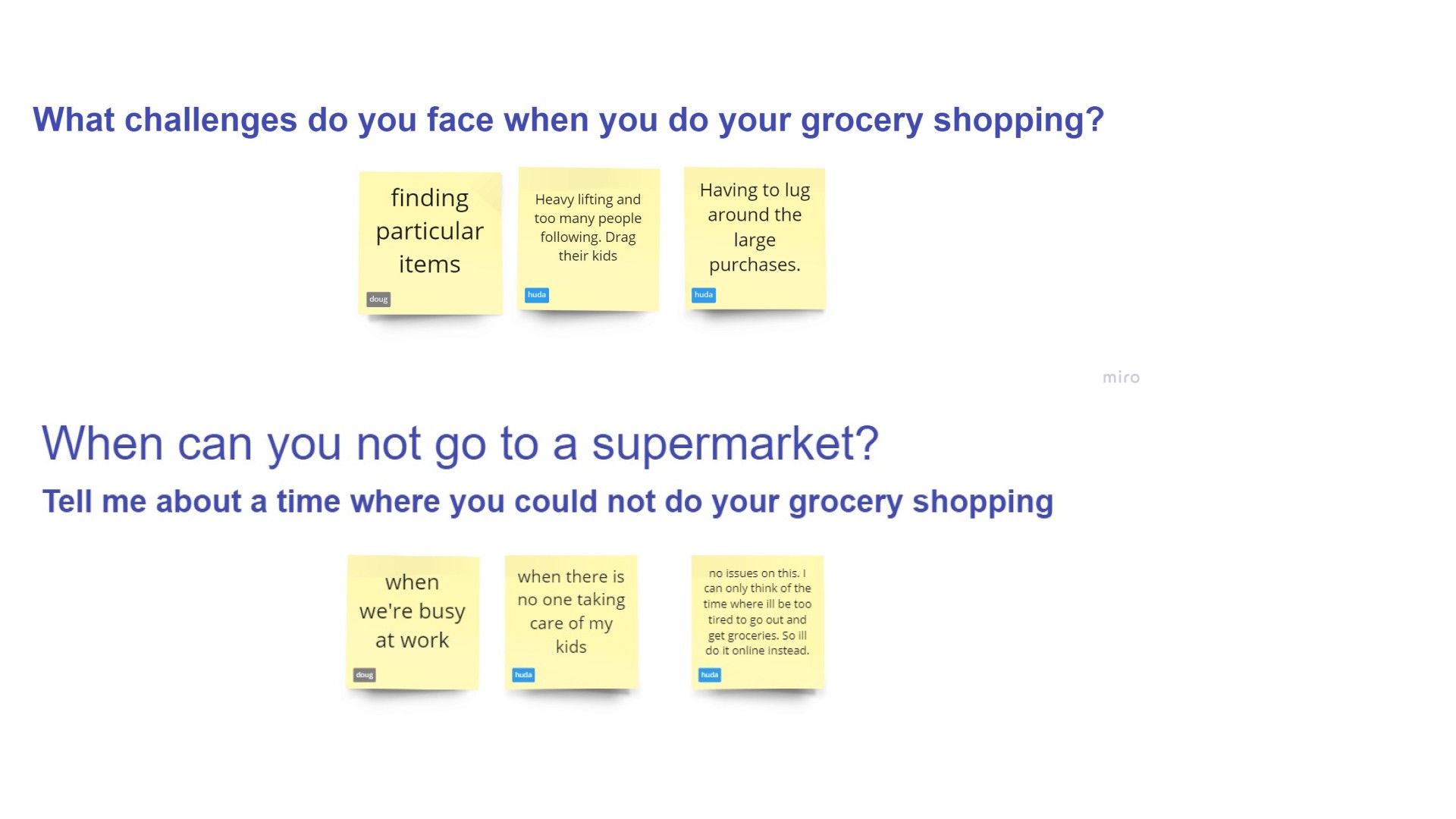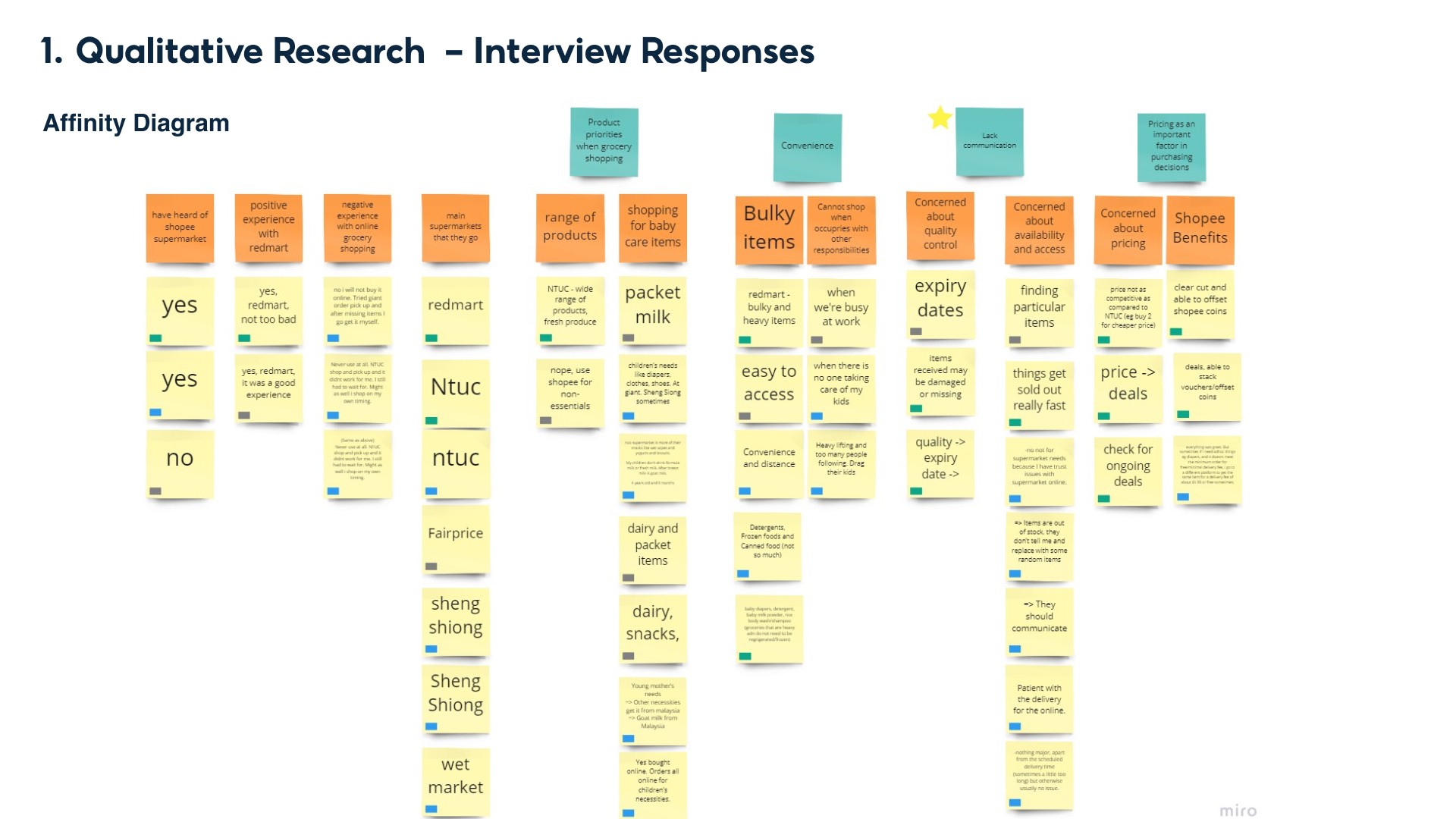 Using semi-structured interviews, we interviewed 5 millennial parents to find out more about their experiences of using online groceries. We chose a semi-structured interview to give us more flexibility in gaining in-depth answers from our users. We then analyzed our results using an affinity diagram.