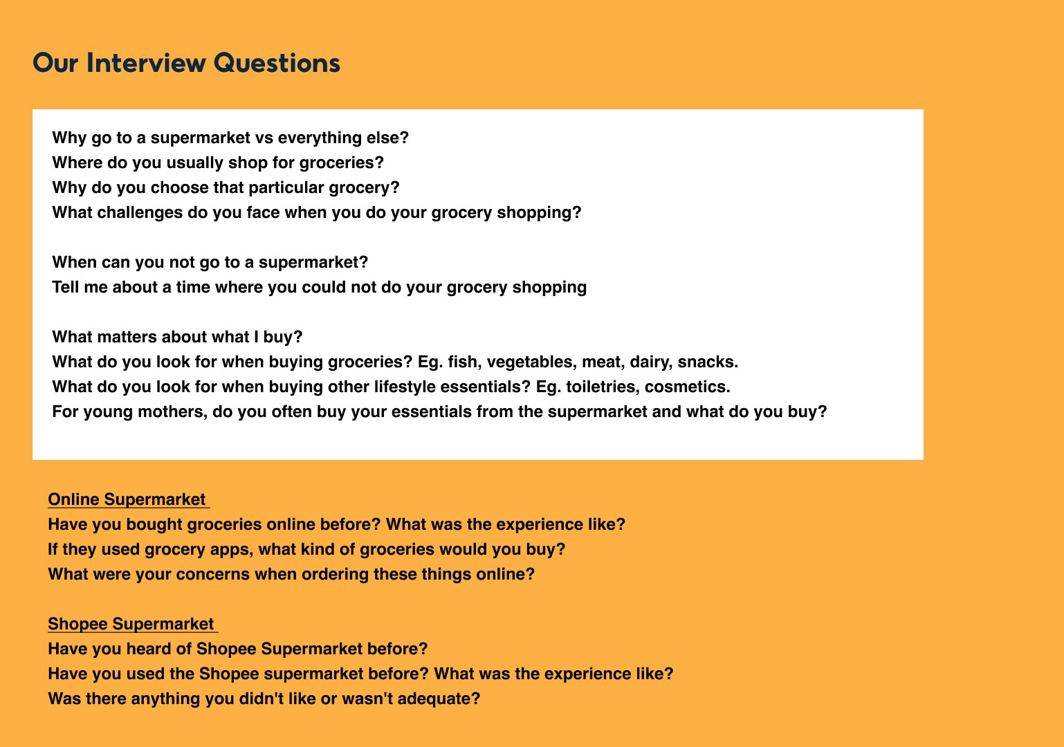 Firstly, we wanted to identify our main target consumers who are using Shopee Supermarket to uncover the issues they faced in using the platform and best design a better experience for them.