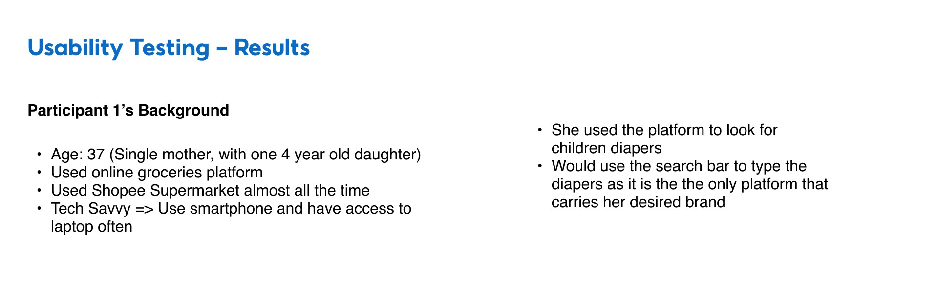 Fortunately, within the span of 5 days, I was able to do a very quick usability test with a young muslim mother on her experience in using Shopee Supermarket. Her responses and how she uses the application gave us more insights on our problem statement and product specifications. These are the results: