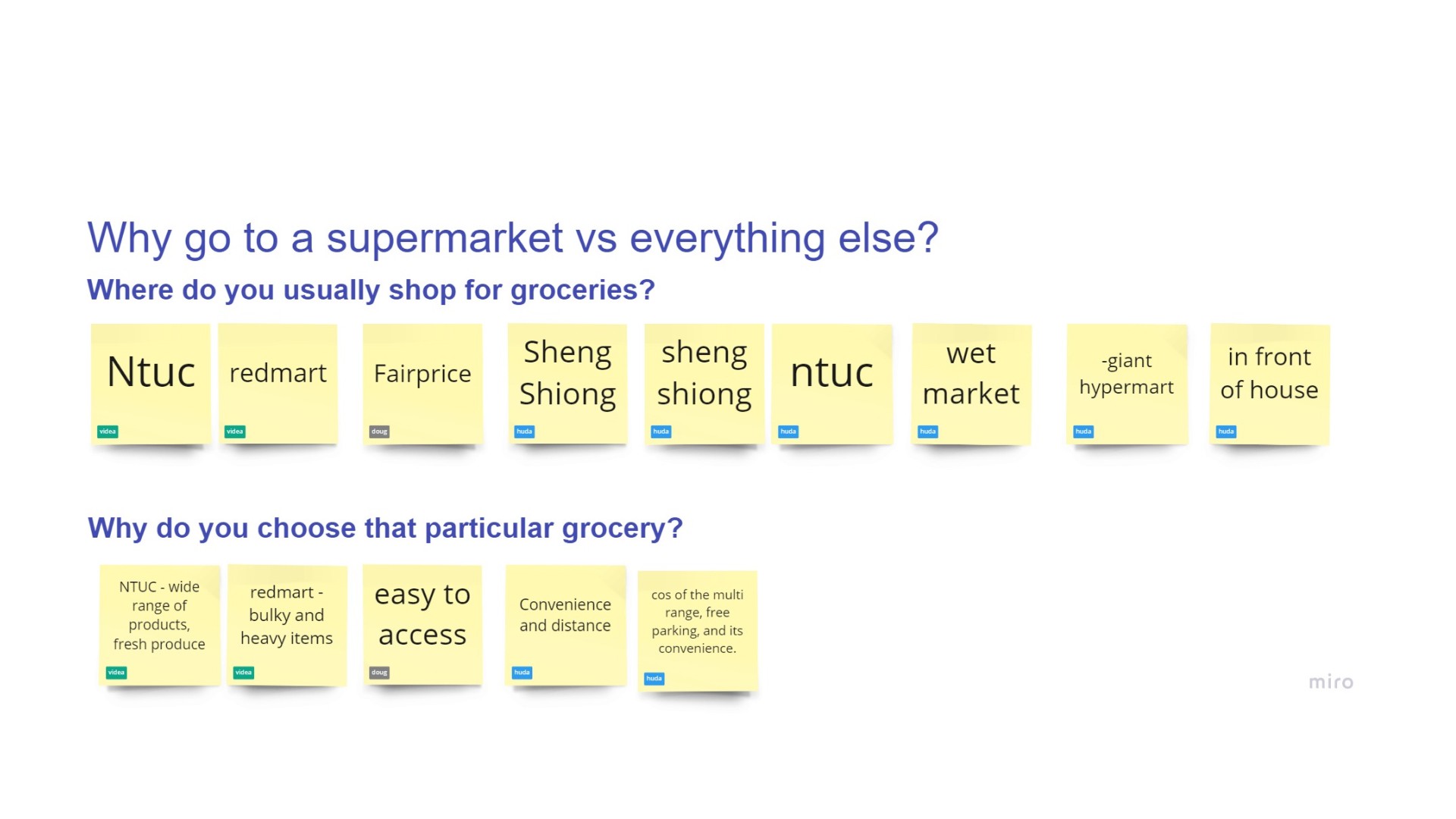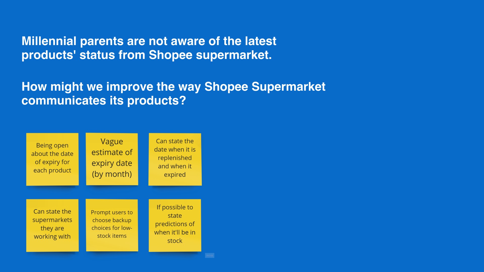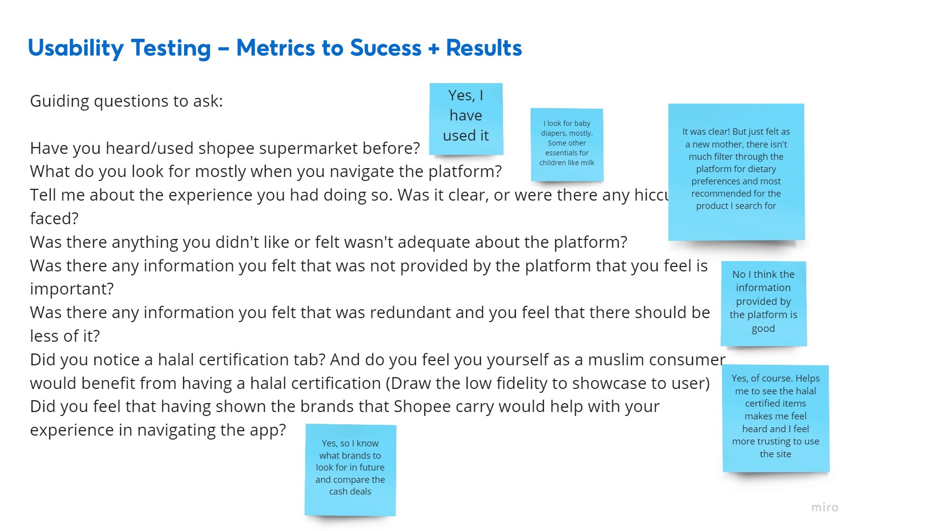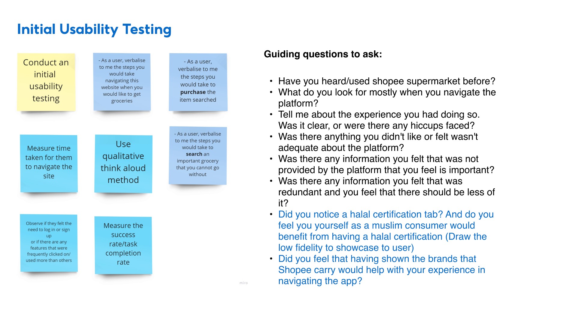 If given more time, we would conduct an initial usability testing on the current features on Shopee Supermarket to gain greater insights on users' pain points and validate our assumptions. The sticky notes on the left was what we would have conduct our user testing.