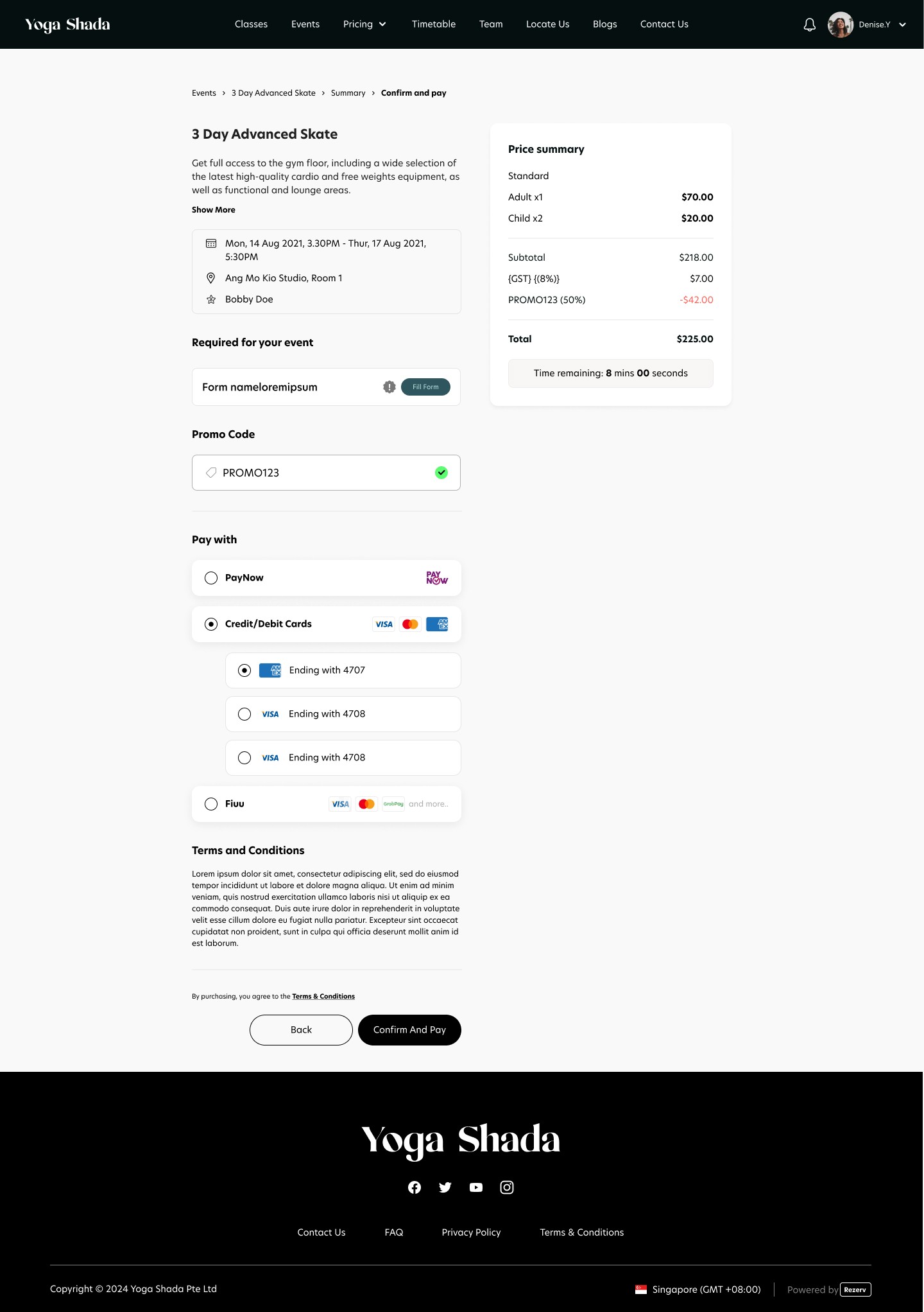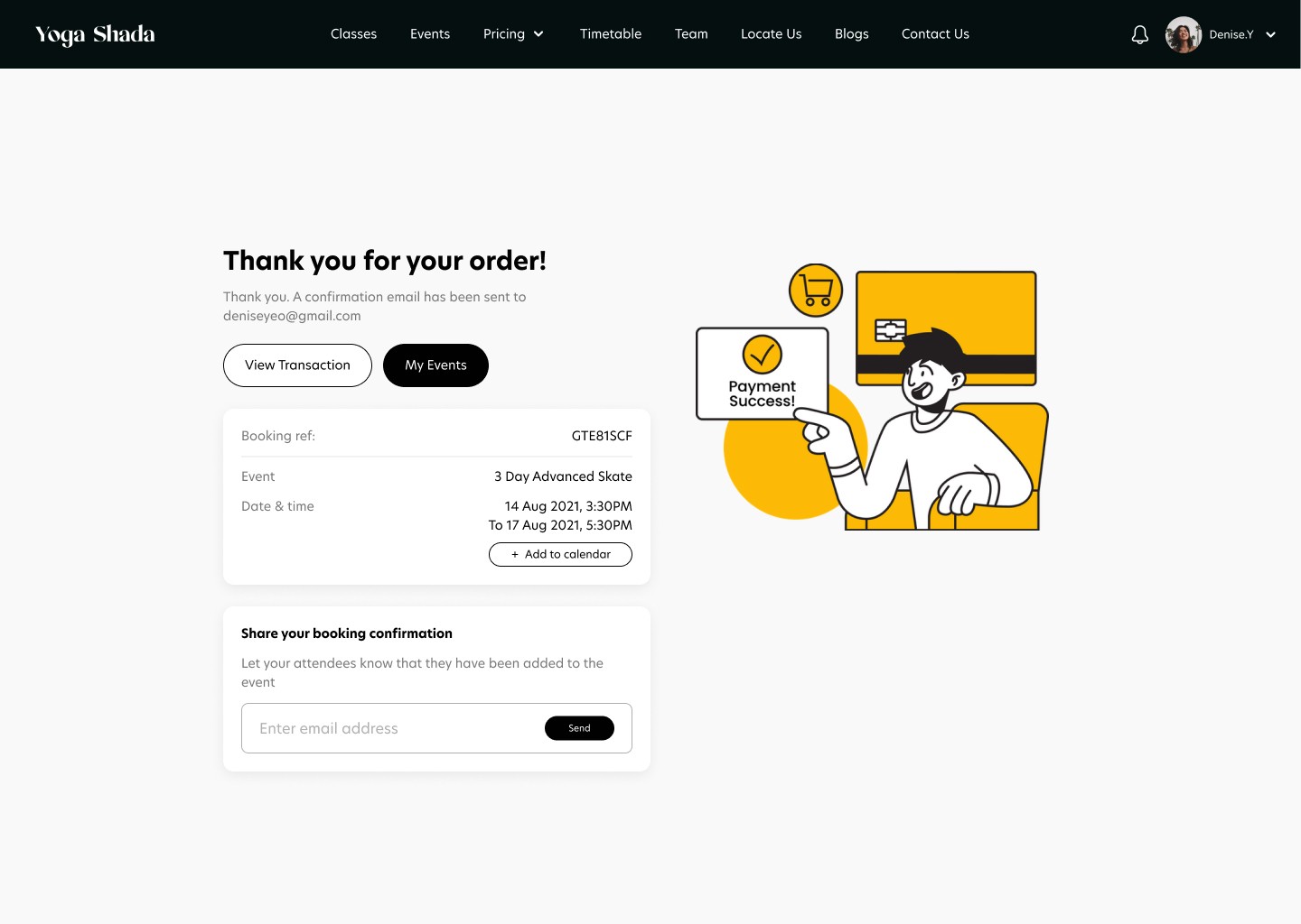 On this page, users can select from multiple payment methods and apply any available discount codes for their event booking. They can also securely add and save their card details, enabling faster and more seamless payments in future bookings. Clicking on "Confirm & Pay" will bring users to a payment success screen if the transaction is successful. Otherwise the screen would show a purchase timeout or payment failed state.